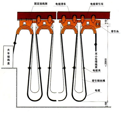 HC型電纜滑車系列為起重機(jī)小車供電的一導(dǎo)電形式,它由走輪、支架、托板組成,將軟電纜固定在托板上,由牽引架與電纜滑車同步,從而實(shí)現(xiàn)小車供電目的。 HC系列電纜滑車分為中載荷型、重載荷型和輕載荷型,因此滑車行走輪為Φ80、Φ63、Φ50的三種,承載能力≤50~150kg每類按托板層數(shù)分為單層、雙層、三層,每類中有三種形式,首端為電纜牽引車,終端為固定掛線架,中間為電纜滑車(見下圖)。