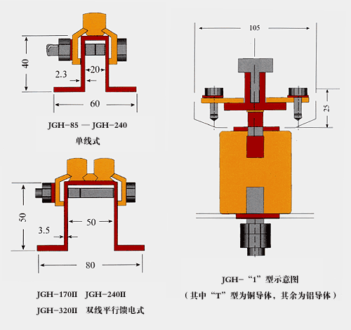 鋼體滑觸線一般情況下按6m定尺長度供貨。 鋼體滑觸線絕緣支架安裝間距一般為3m 滑觸線分為單線式和雙線平等饋電式兩種,除雙線平等式以JGH-□II表示外,單線式不另加表注,其斷面如下: